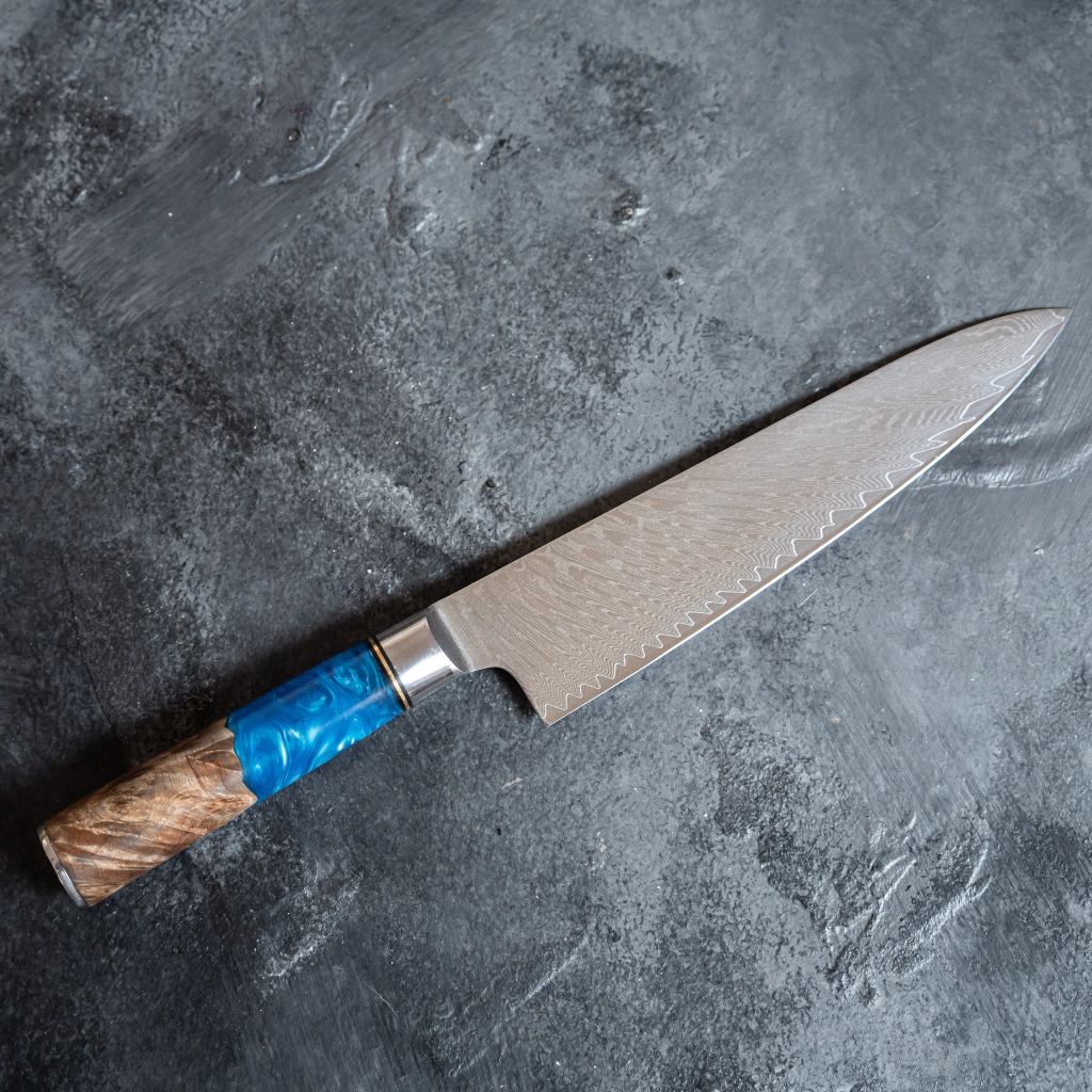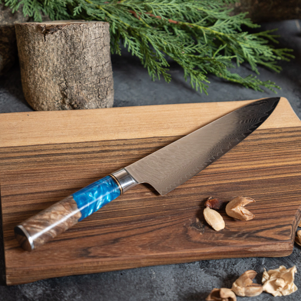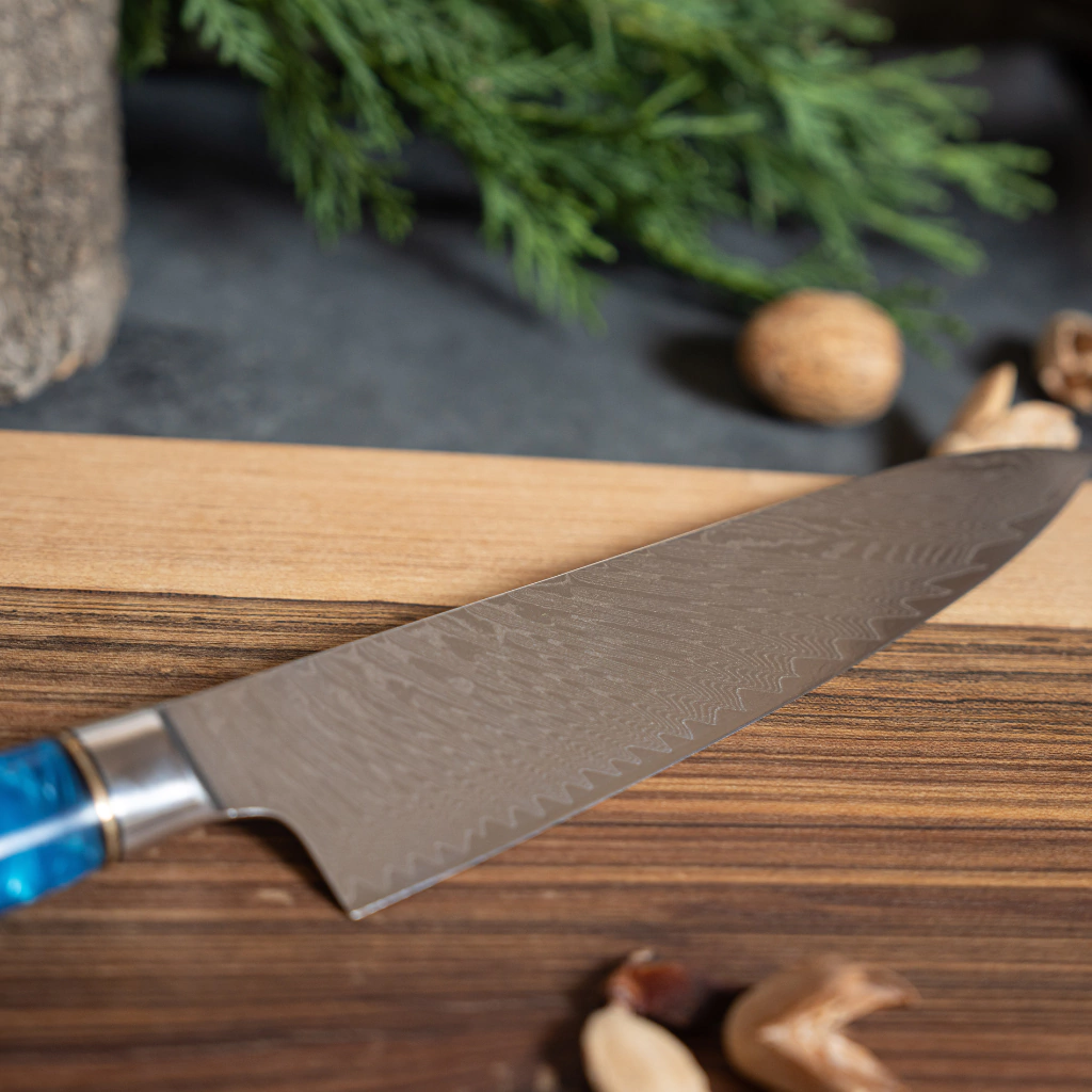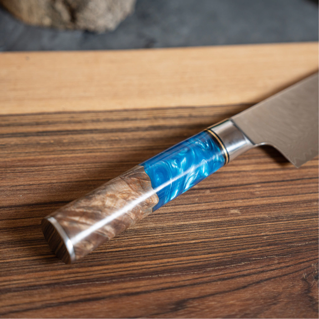 Faca fabricada em aço damasco de 67 camadas com lâmina de 20 cm tipo meio bisel. O cabo é feito de epóxi inerte azul com madeira de oliveira, oferecendo um grip firme e confortável.