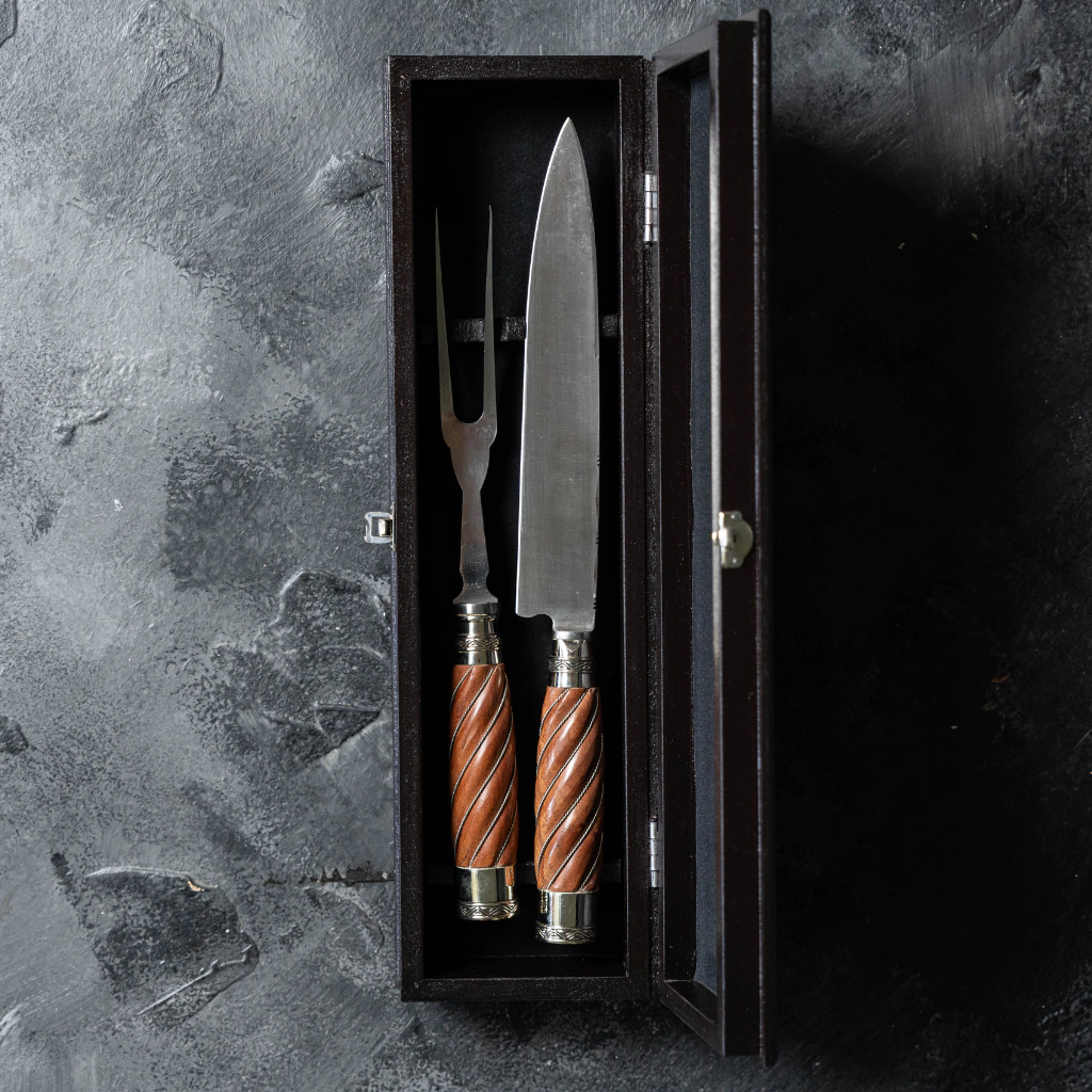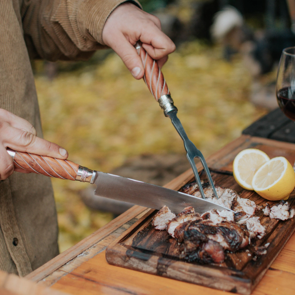 Transforme seus churrascos em família ou com amigos com nosso conjunto exclusivo que inclui uma faca de aço inoxidável de 20 cm e um elegante garfo de trinchar. O cabo, feito à mão por artesãos argentinos com madeira galloneada e fios de alpaca, traz um estilo único.