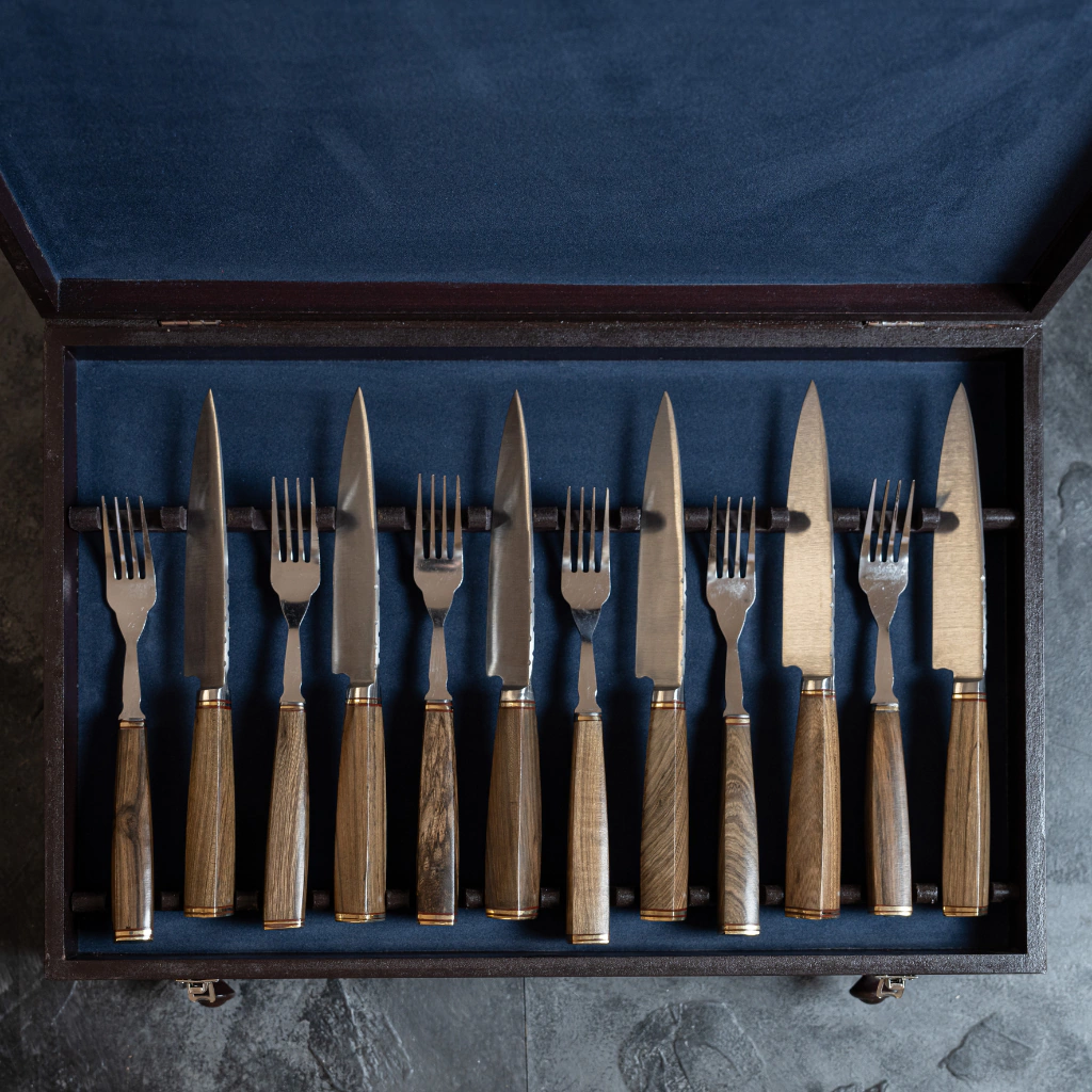 Revolucione seus churrascos com família ou amigos com nosso jogo de talheres disponível em 12 unidades (para 6 pessoas) ou 24 unidades (para 12 pessoas). Cada peça possui um cabo de madeira dura de guayubira, adornado com detalhes em bronze que adicionam um toque de sofisticação. A lâmina de aço inoxidável de 14 cm garante durabilidade e estilo.