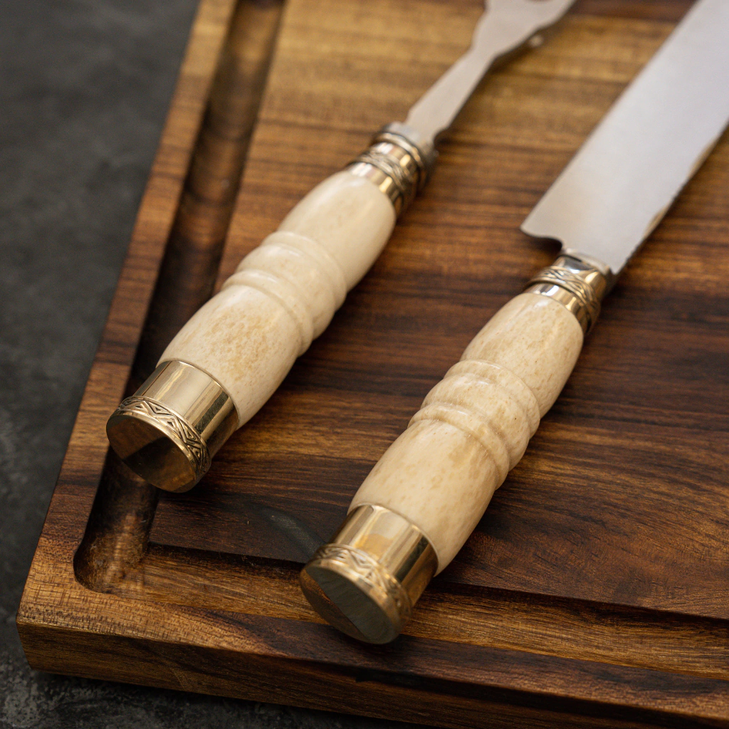 Transforme seus churrascos em verdadeiras celebrações com nosso exclusivo conjunto trinchante de osso de cavalo. Composto por uma faca de aço inoxidável de 20 cm e um garfo de trinchar, cada peça apresenta cabo em osso de cavalo selecionado, adornado com botão e virola de alpaca pura feita à mão.