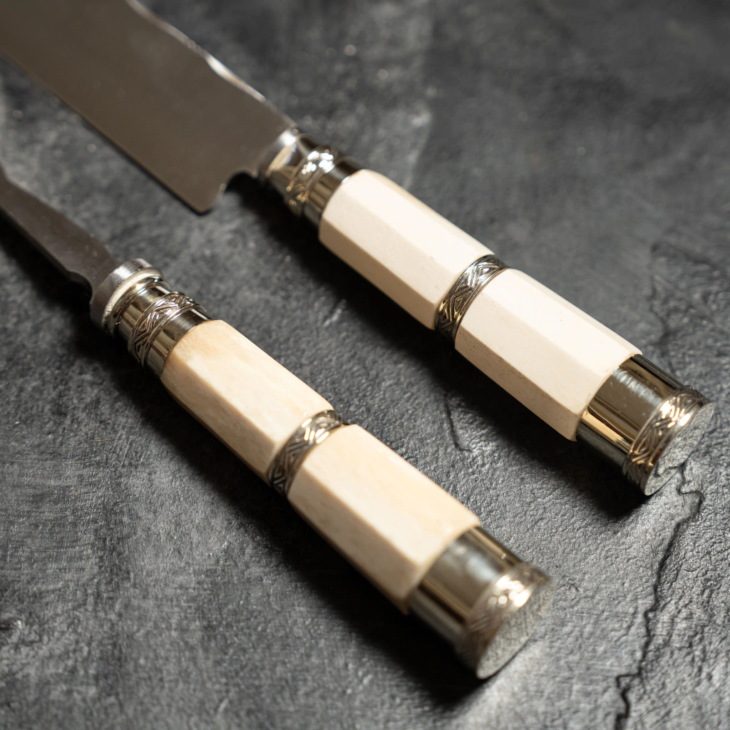 Transformá tus comidas en auténticas experiencias con nuestro exquisito juego de trinchar de hueso. Este conjunto incluye un cuchillo de acero inoxidable de 20 cm y un tenedor de trinchar, ambos con un elegante mango de hueso octogonal trabajado a mano y triple alpaca de alta calidad.