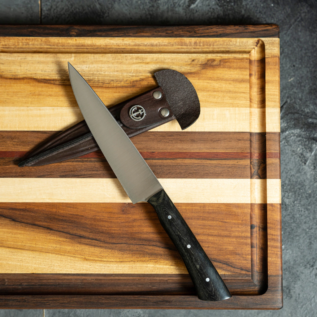 Una pieza de alto rendimiento y estética refinada. Su hoja de acero de primera calidad ofrece un filo duradero y preciso, ideal para cortes grandes y exigentes. El mango está hecho de Micarta, un material resistente y elegante que combina capas de lino o papel prensado con resina, lo que le da una textura firme, antideslizante y sumamente duradera, incluso en ambientes húmedos o grasos.