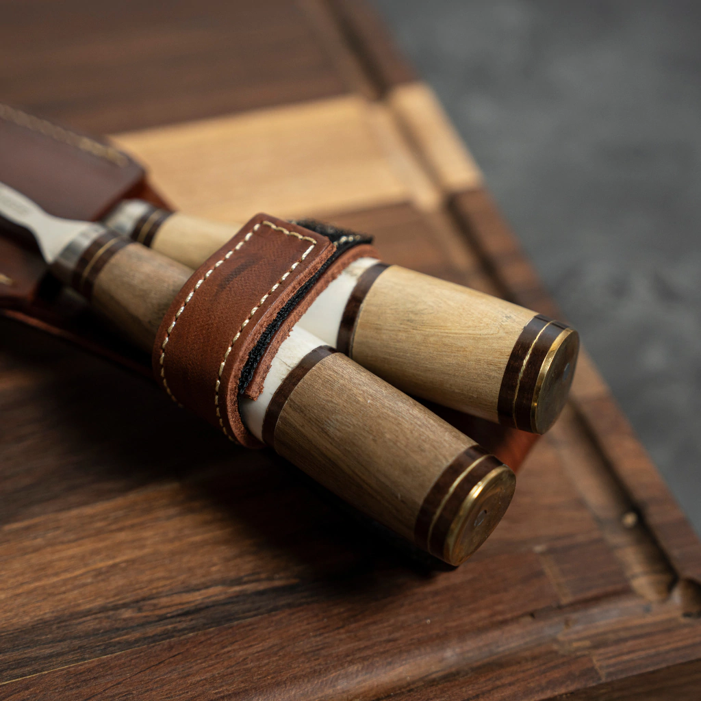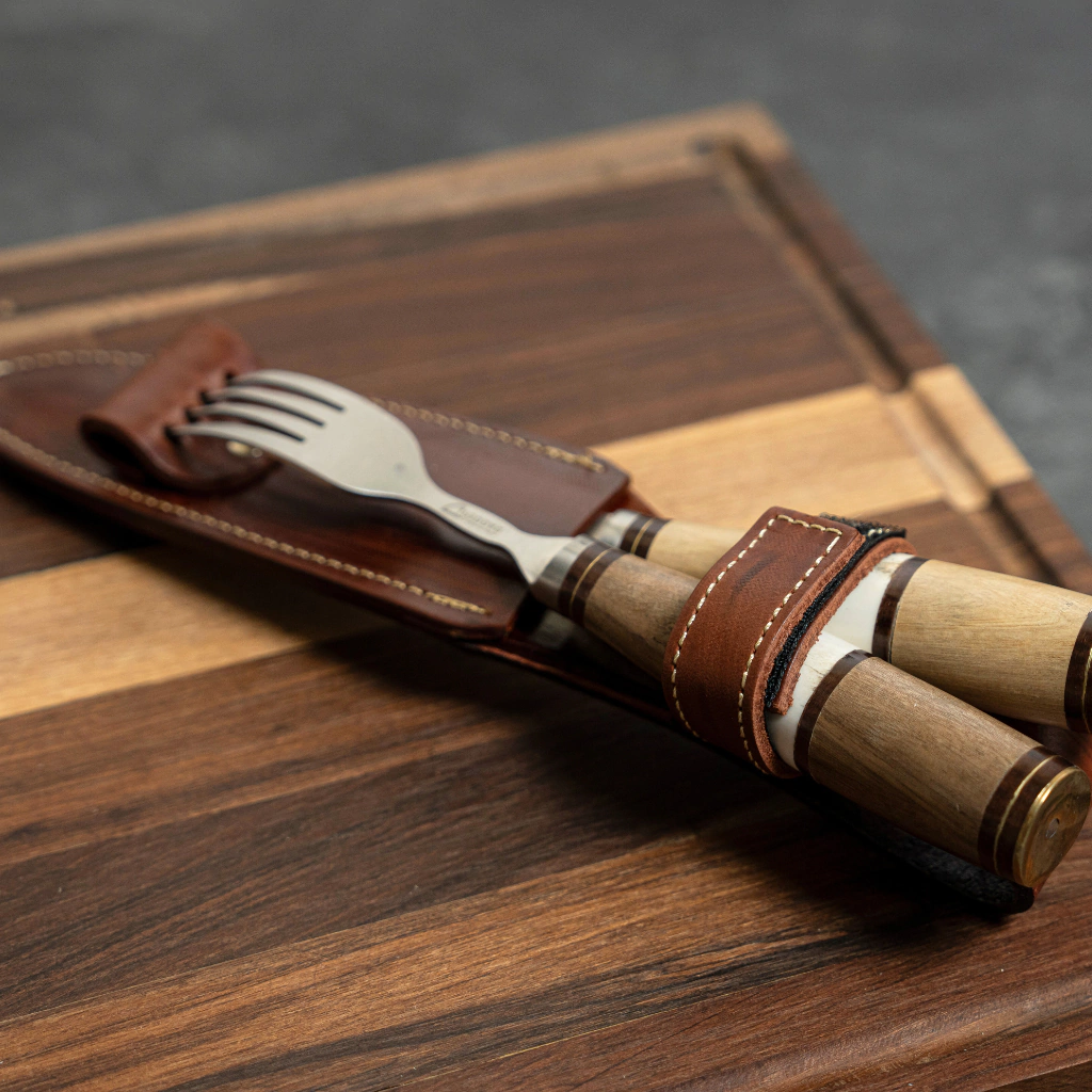 Transformá tus comidas en experiencias memorables con nuestro juego individual que incluye cuchillo y tenedor. Cada pieza cuenta con una hoja de acero inoxidable de alta calidad de 14 cm, y un elegante cabo de madera combinada con hueso seleccionado, adornado con terminaciones en bronce.