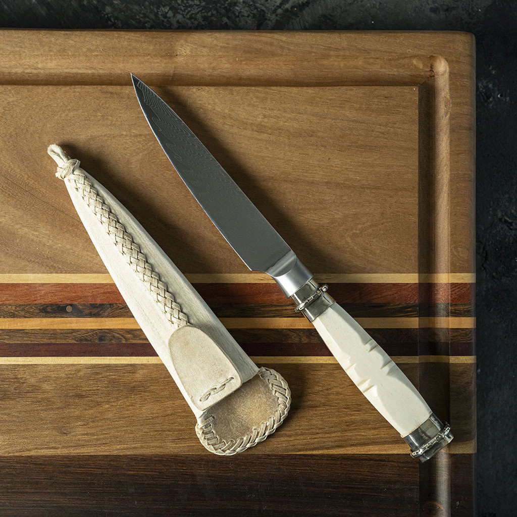 La empuñadura está compuesta con hueso seleccionado con botón y virola de alpaca. Cuenta con una vaina de cuero clara.