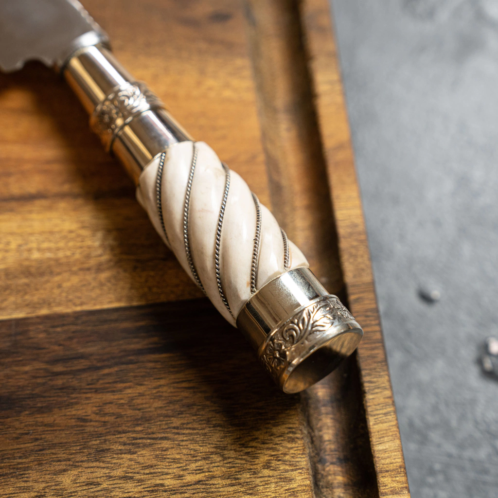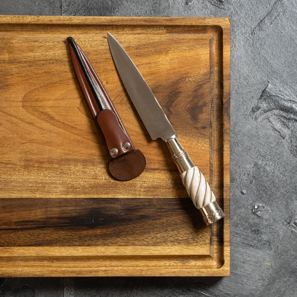 Con hoja de acero inoxidable de alta calidad, disponible en 14cm o 20cm, y un cabo de ciervo torneado a mano, este cuchillo destaca por sus hilos de alpaca, botón y virola premium decorados. Además, incluye una vaina de cuero a medida para conservarlo seguro y con estilo.