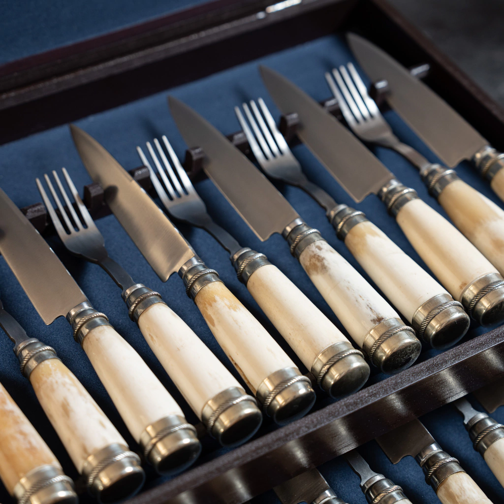 Transformá tus asados en familia o amigos en verdaderas celebraciones con nuestro exclusivo juego de cubiertos. Disponibles en 12 unidades (6 comensales) o 24 unidades (12 comensales), cada pieza cuenta con un mango de hueso seleccionado y virola en alpaca, que añaden distinción a tu mesa. La hoja de acero inoxidable de 14 cm garantiza calidad y durabilidad.