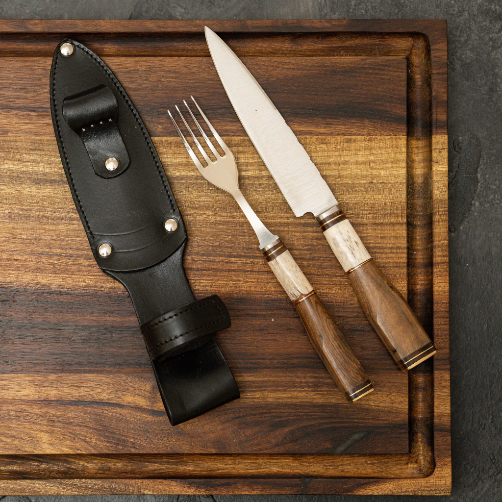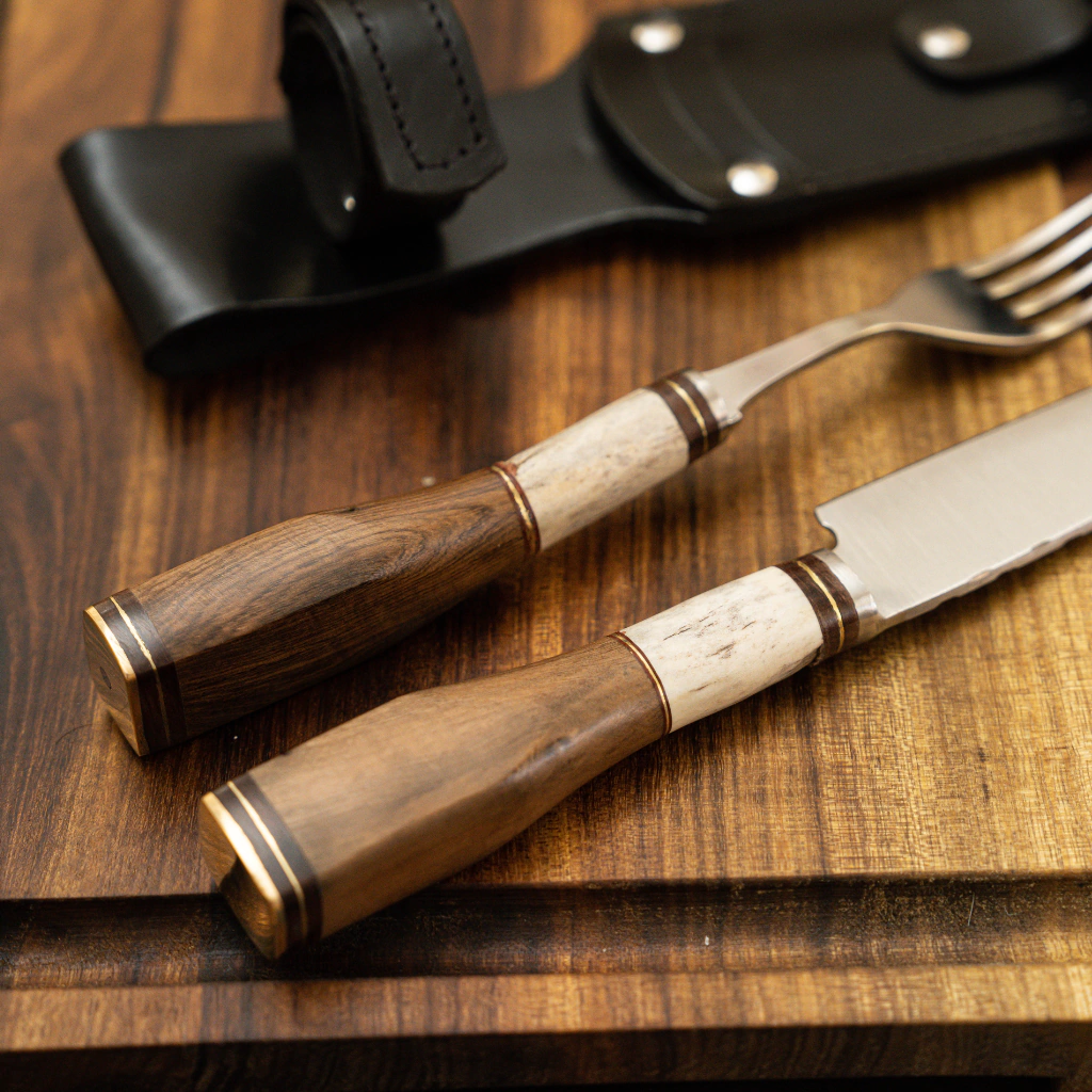 Descubrí la combinación perfecta de diseño y calidad con nuestro juego individual de tenedor y cuchillo en ciervo y madera. Con hojas de 14 cm de acero inoxidable premium, y un mango que fusiona la madera dura y el asta de ciervo seleccionada, cada pieza es un verdadero arte. La terminación en bronce añade un toque de distinción.