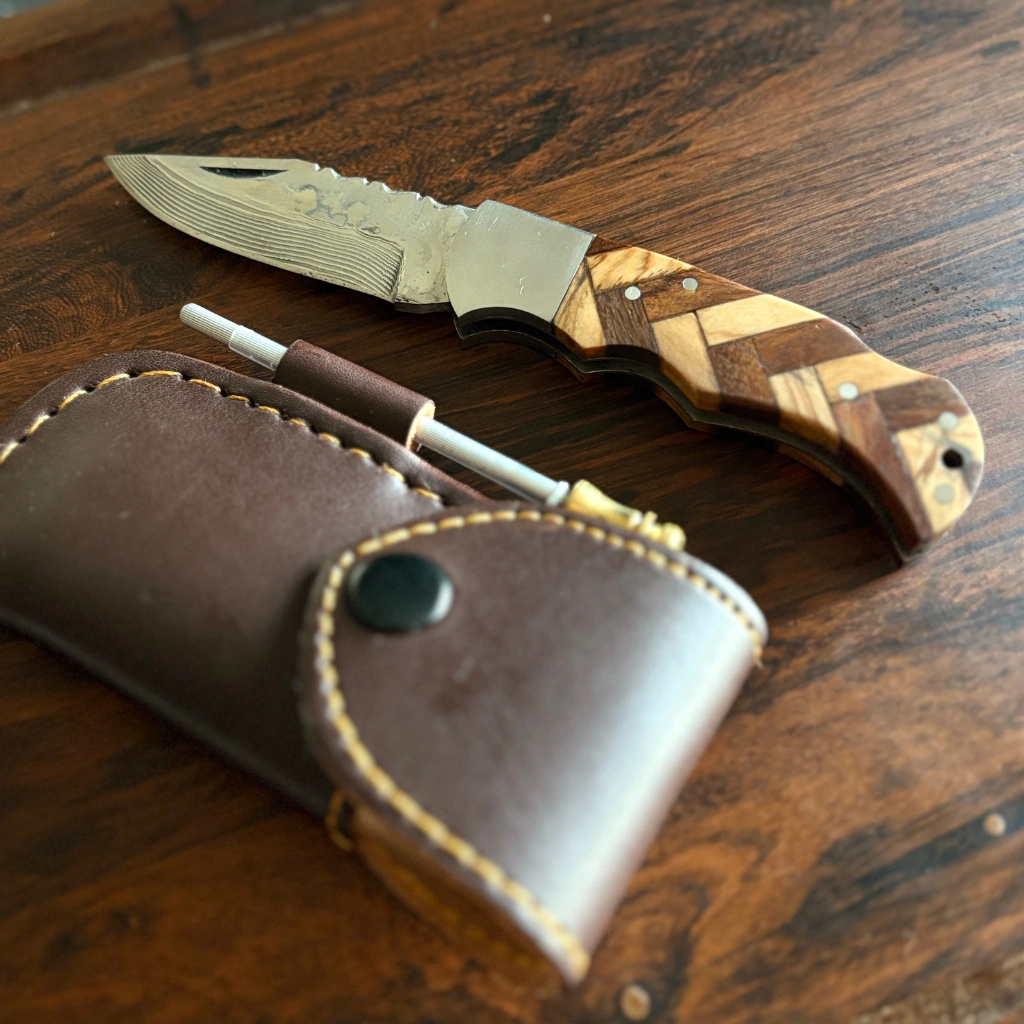 Navaja plegable premium con cabo doble madera combinada, con hoja de acero damasco de 115 capas, con una logitud de 7cm de hoja.