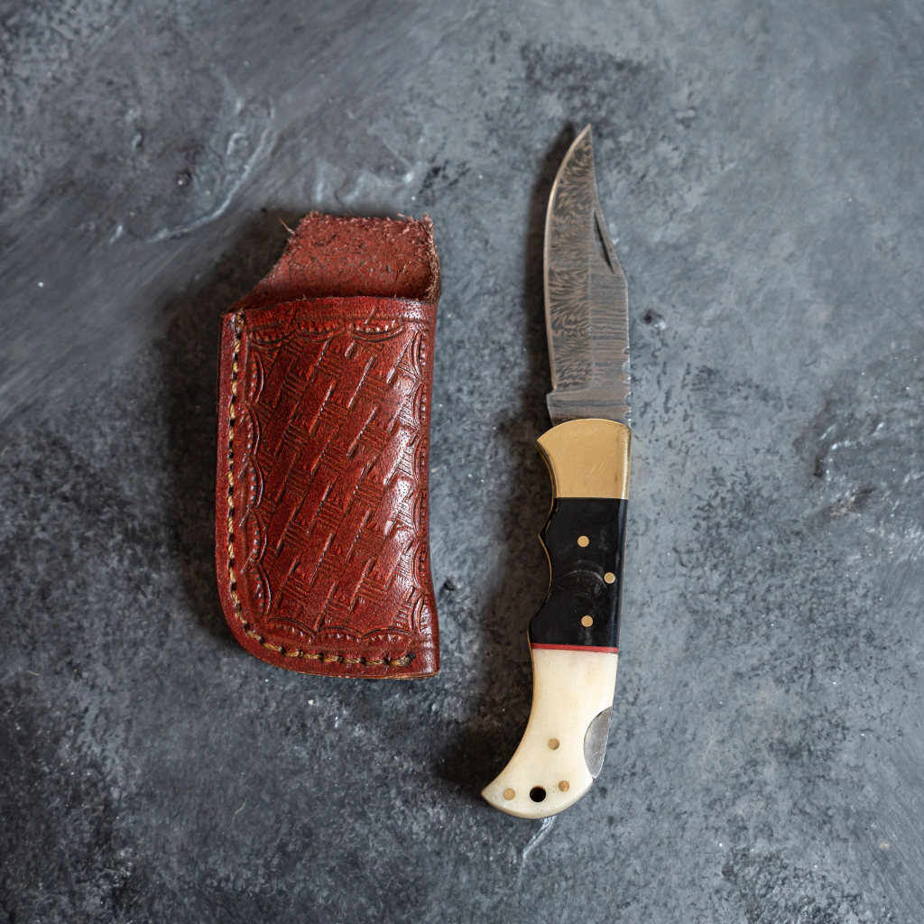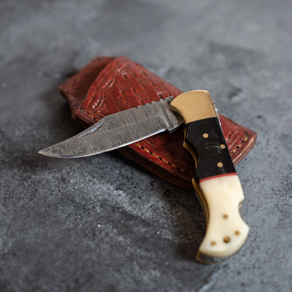 Navaja plegable premium con cabo de hueso combinado con madera de olivo y resina epoxi, con hoja de acero damasco de 115 capas, con una logitud de 7cm de hoja.